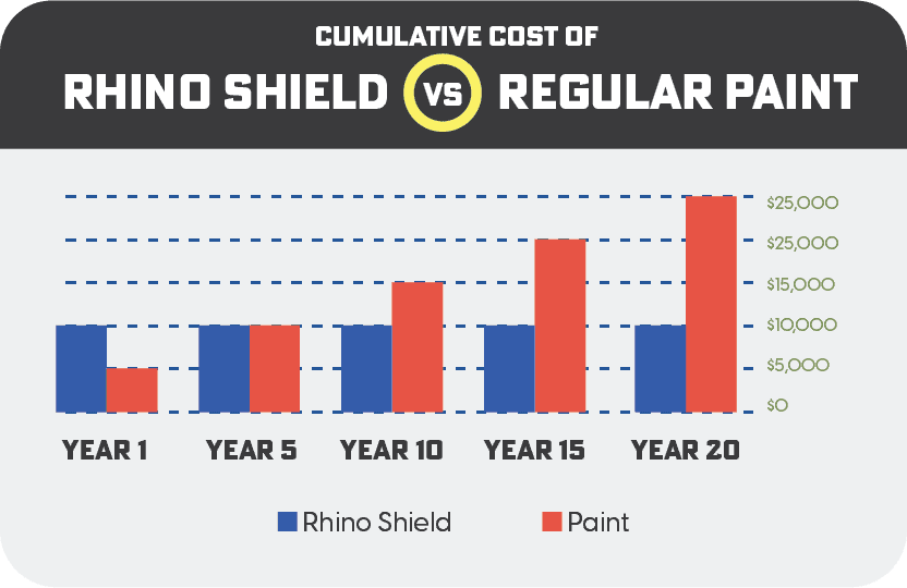 Rhino Shield’s application results in a more resilient finish with less frequent maintenance compared to traditional elastomeric paint.